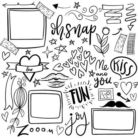 キュートで乙女チックな描かれた落書きステッカーのセットです 面白い シンプルでおしゃれなイラスト シンプルなアイコン ハートとリボン のイラスト素材 ベクタ Image